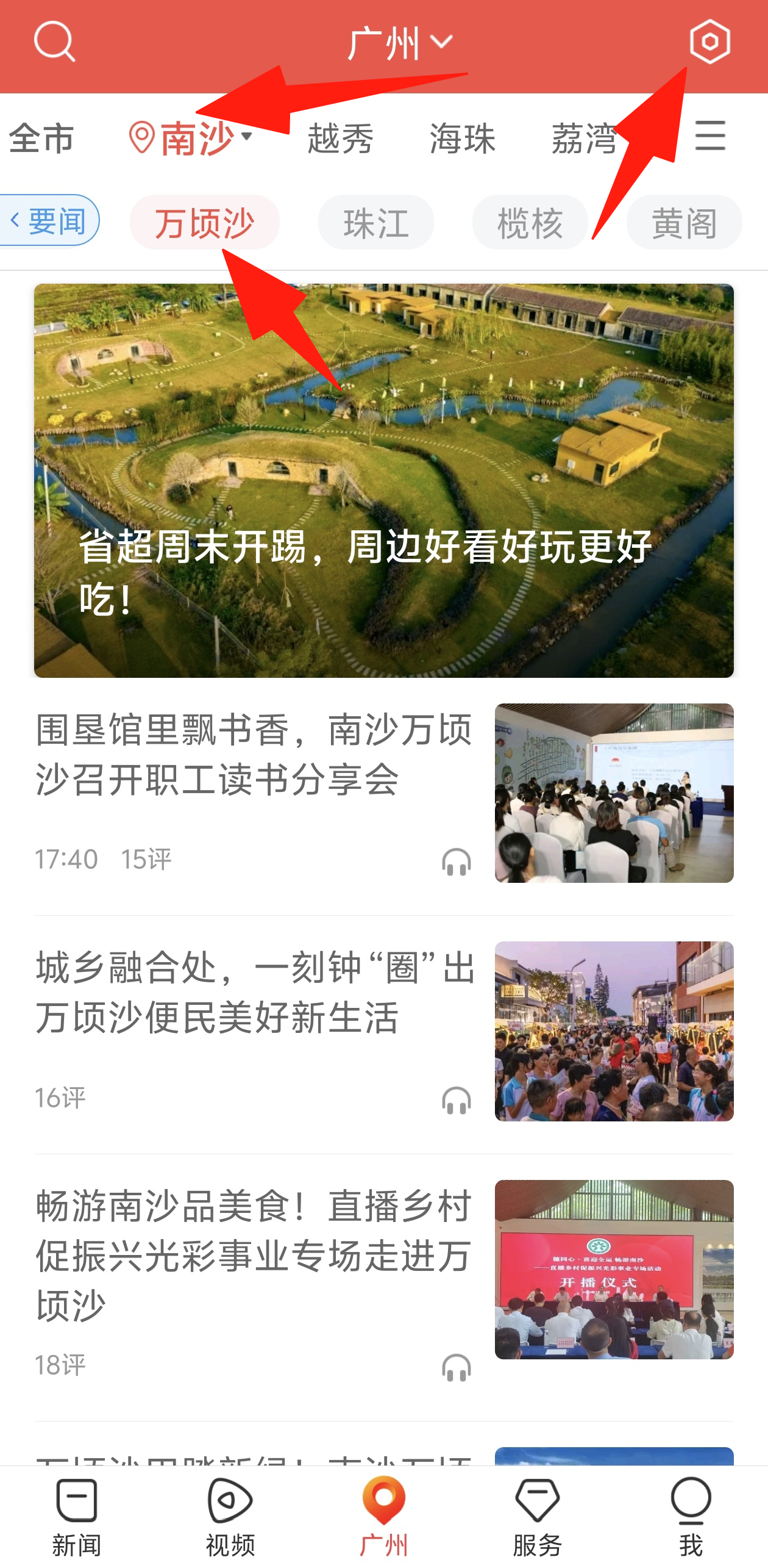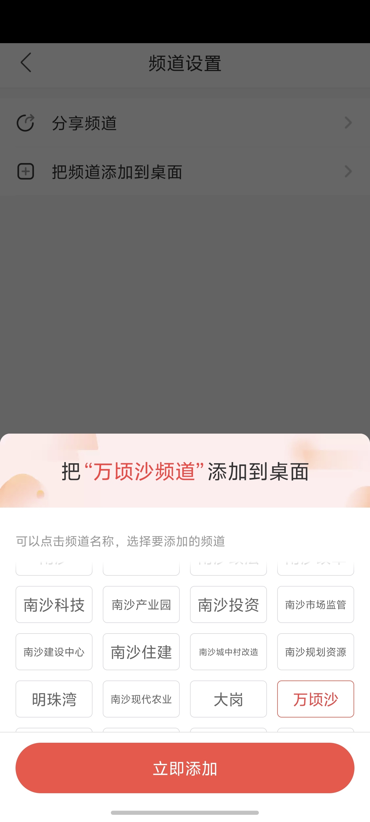 第二步:点击“南沙”后,左滑下方频道,点击“万顷沙”后,再点击右上方的设置符号,点击“把频道添加到桌面”。