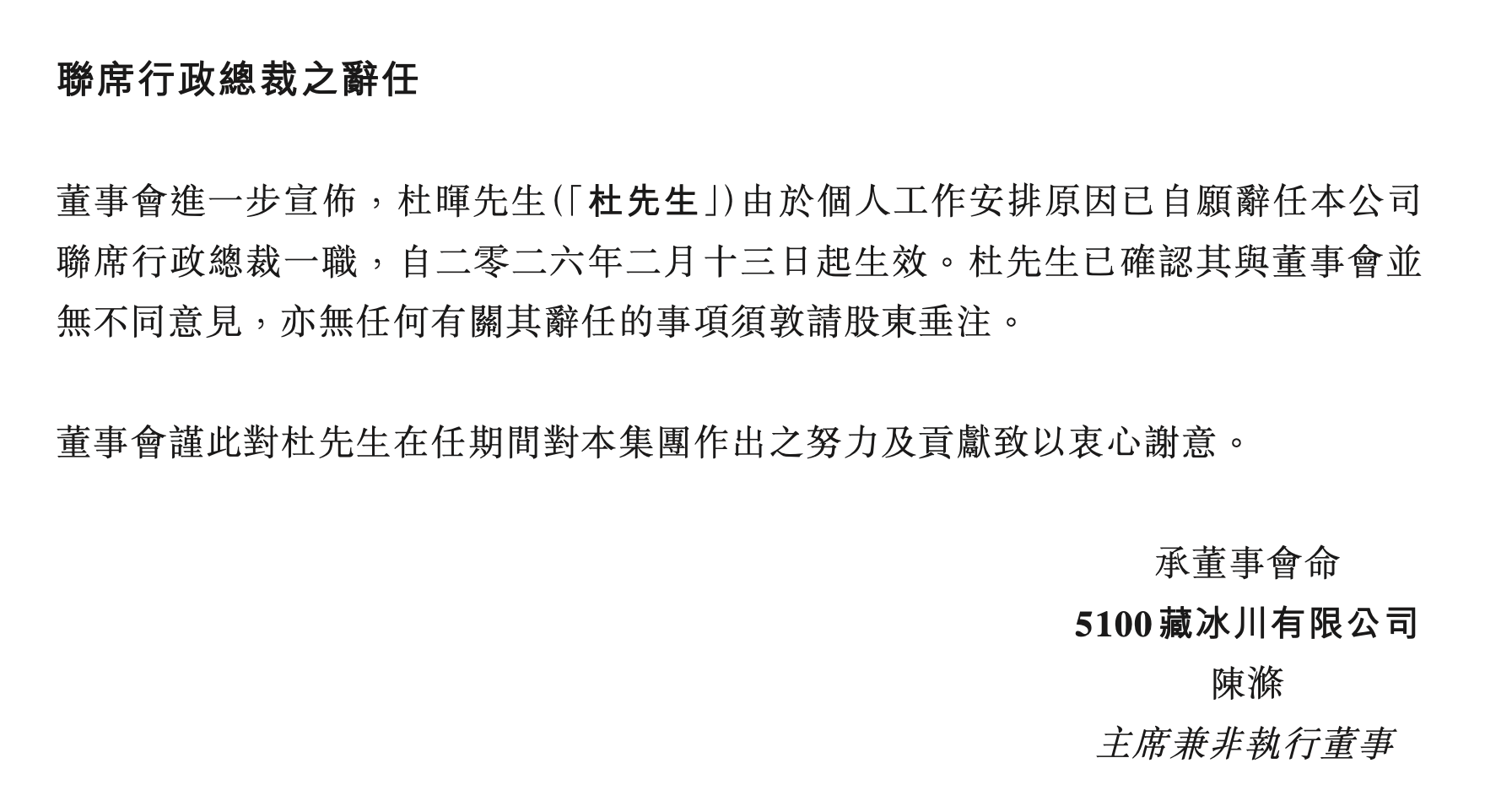 公告显示,“杜晖因个人工作安排辞任联席行政总裁一职。”