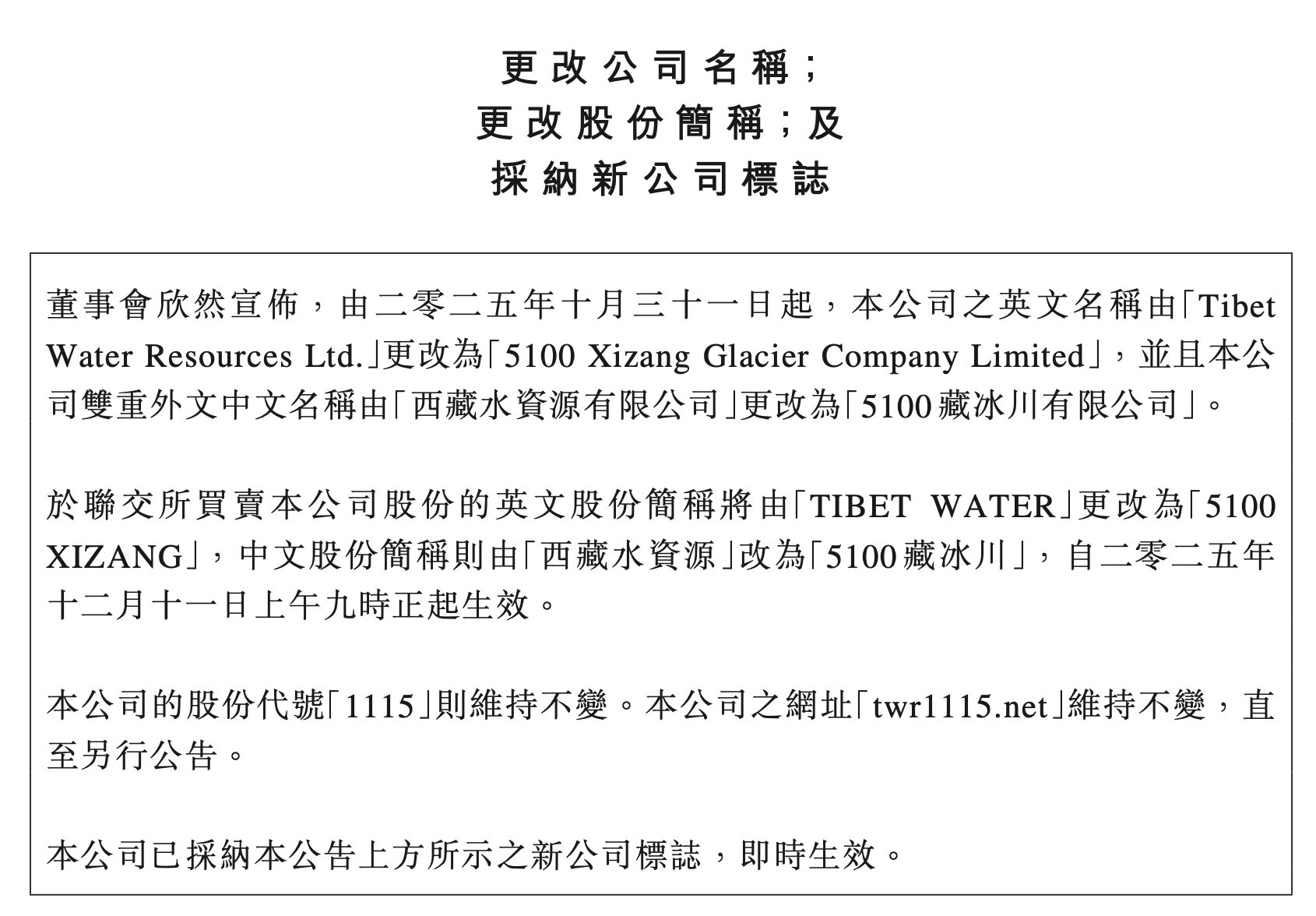 去年10月底,公司名由“西藏水资源”更改为“5100藏冰川”。公司表示,更名能向市场提供更好的企业形象,增强集团品牌影响力。