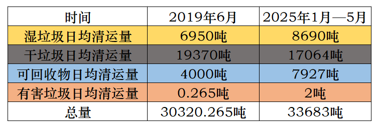 根据上海绿化市容部门公布的最新数据,上海分类成效显著,2025年前5个月,上海日均分出可回收物7927吨、有害垃圾2吨、湿垃圾8690吨,比2019年上半年分别增加1.96倍、13.6倍、59%;日均清运干垃圾17064吨,比2019年上半年减少16.7%。