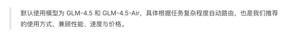 接下来,我在官方文档了解到,GLM-4.5 在调用模型时不是默认最强的版本,而是会通过多因素权衡来灵活调用 GLM-4.5 或 GLM-4.5-Air 。