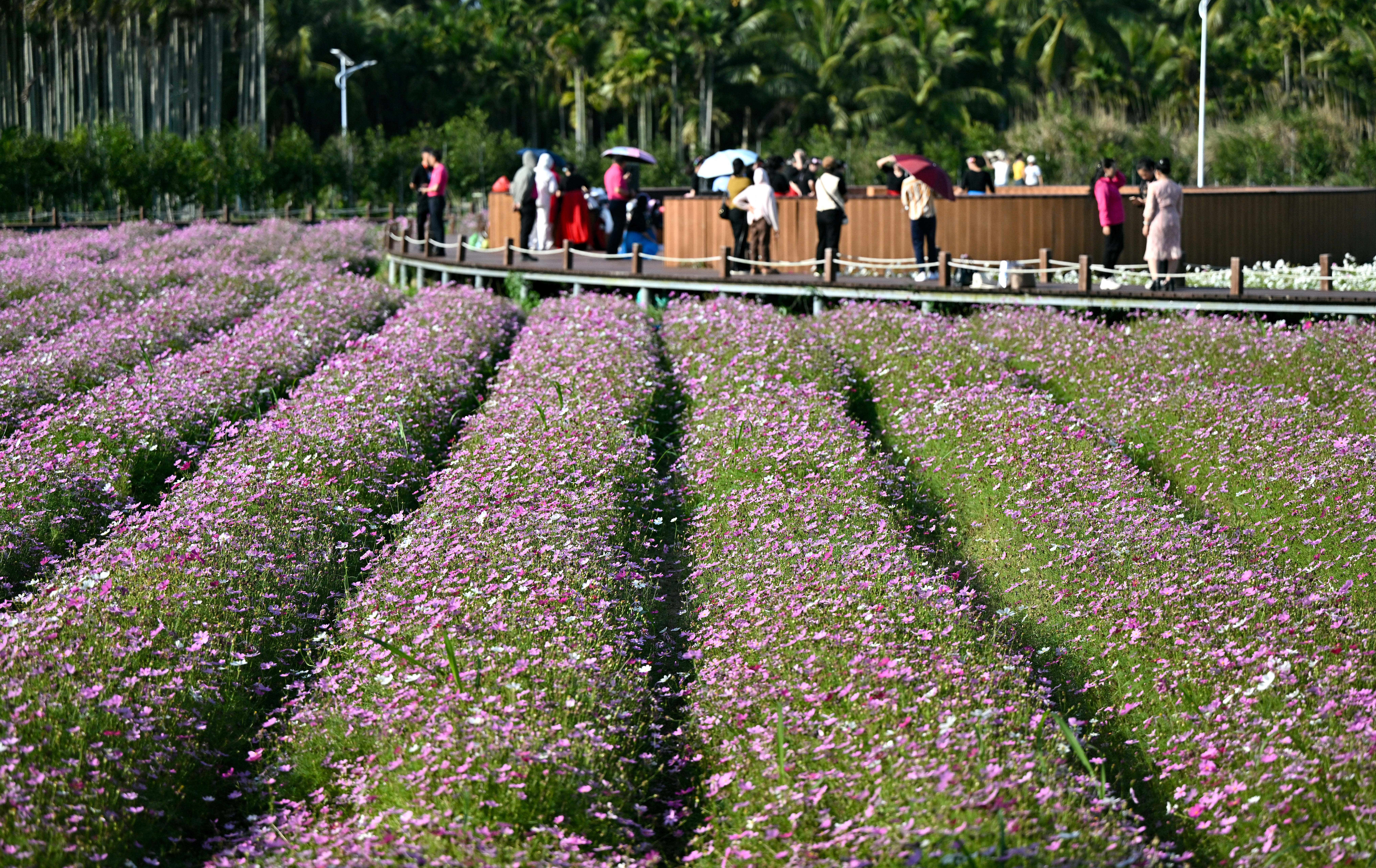 博鳌亚洲论坛2026年年会临近,琼海市博鳌镇南强村数十亩主题花海迎来盛放期,吸引游客前来踏青赏花。