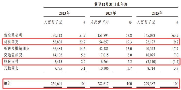 与半导体及新型显示业务商业化进展缓慢相伴随的,是帝尔激光在报告期末研发费用总额的缩减以及内部费用结构的异常变动。财务数据显示,帝尔激光的研发开支在经历了2023年的约2.51亿元和2024年的约2.83亿元后,2025年出现显著收缩,同比下降18.8%至约2.29亿元。公司称,主要是由于与研发样机开发及测试相关的成本减少,以及未归属的以股份为基础的付款开支减少。