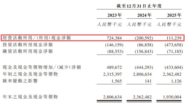 这种收入确权周期的延长与营运资金的沉淀,直接影响了公司的现金流量。招股书显示,2023年帝尔激光的经营活动所得现金净额约7.24亿元,与当期利润规模相匹配。但该项数据在2024年转为负值,录得经营活动现金流出约2.01亿元,主要受到贸易应收款项增加及合同负债减少的影响。尽管在2025年,公司的经营活动所得现金净额回正至约1.11亿元,但这与当期5.19亿元的利润之间仍存在约4亿元的缺口。