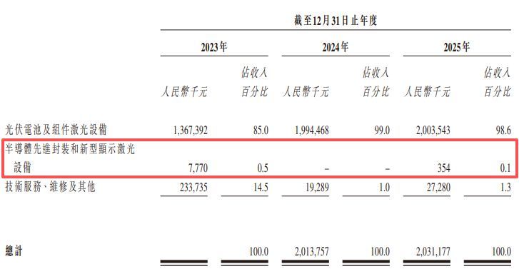 招股书显示,帝尔激光的“半导体先进封装和新型显示激光设备”分部在2023年实现营收约777万元,占当年总收入的0.5%。但在2024年,该业务分部的收入直接归零,招股书对此解释为“年内并无设备获验收,故并无确认任何收入”。进入2025年,该业务分部仅实现营收35.4万元,占公司全年总收入的比例仅0.1%。整个报告期内,这一被公司寄予厚望的新兴业务线累计确权收入约为812.4万元。