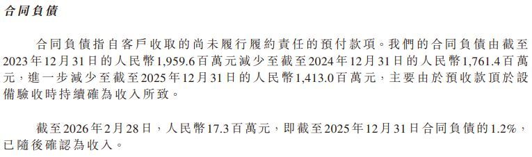 招股书显示,帝尔激光的合同负债在过去三年间出现持续且大幅下降。截至2023年末,公司的合同负债规模为19.6亿元,至2024年末下降至17.61亿元,而到了2025年末则进一步降至14.13亿元——过去两年时间内,合同负债的账面金额减少了5.47亿元。公司称,主要由于预收款项于设备验收时持续确认为收入。