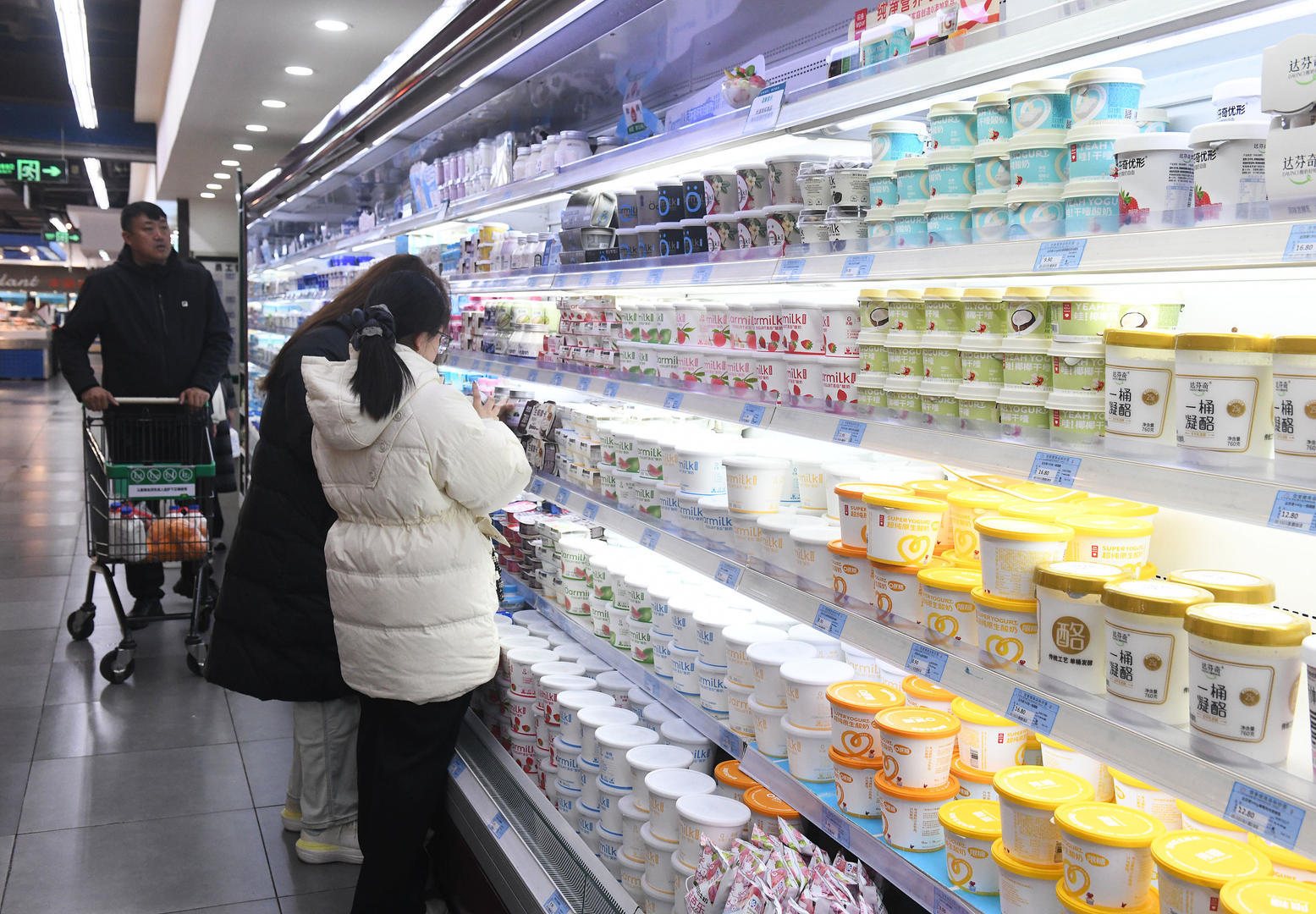 ▲2月28日,消费者在河北石家庄一家超市选购乳制品